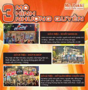 Một trong những cái tên nổi bật chính là Mr. Pokki – thương hiệu ăn vặt Hàn Quốc đang phát triển nhanh tại Việt Nam. Với nhiều gói nhượng quyền linh hoạt, Mr. Pokki phù hợp cho sinh viên, nhân viên văn phòng, hay cả chủ quán cà phê – trà sữa.